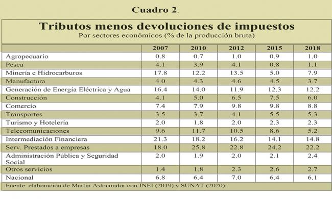 En el cuadro 2 se muestra la evolución de la recaudación sectorial de tributos menos las devoluciones por actividades económicas, equivalente a su aportación neta al gobierno peruano. No hay sorpresas. Los sectores de menor procesamiento de las materias primas y de contenido tecnológico como la minería e hidrocarburos y la pesca son los que muestran las mayores reducciones en sus aportaciones netas de impuestos. La minería e hidrocarburos pasó del 17.8% a 7.9%, y la pesca del 4.1% al 1.1% entre 2007 y 2018 de sus producciones brutas respectivas. Llama también la atención el comercio, la construcción y telecomunicaciones que también han reducido sus aportaciones netas.