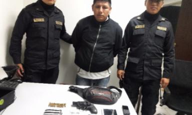 Este sujeto aseguró ser agente de la empresa de seguridad Zeus; sin embargo no tenía licencia para portar armas de fuego. La policía refirió que pertenecería a la banda delincuencial Los Elefantes. (Redacción Central)